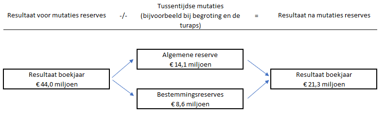 We sluiten het jaar 2021 af met een positief financieel resultaat voor mutaties in de reserves van € 44,0 miljoen. Gedurende het jaar zijn overeenkomstig de genomen raadsbesluiten mutaties gedaan in de reserves. Per saldo is er in 2021 al € 14,1 miljoen toegevoegd aan de algemene reserve. Daarnaast is er per saldo € 8,6 miljoen toegevoegd aan diverse bestemmingsreserves voor door de raad bestemde uitgaven die in toekomstige jaren nog volgen. Door deze mutaties die al in het jaar gedaan zijn, komt het positieve financieel resultaat na mutaties in de reserves in 2021 uit op € 21,3 miljoen. Schematisch ziet dit er als volgt uit: